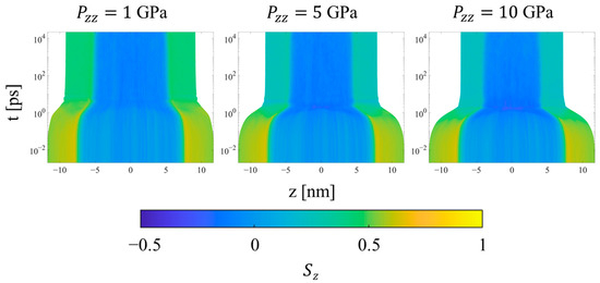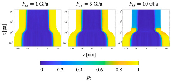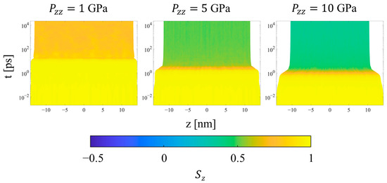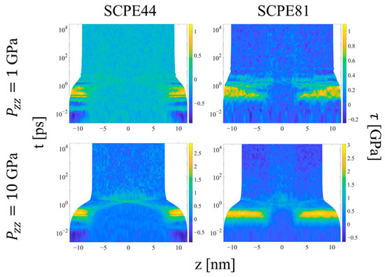 Upon the initial application of the shock pressure, one observes two major regimes of compression, as illustrated by the evolution of local order parameters with logarithmic time in Figure 11, Figure 12 and Figure 13. Figure 11 shows the spatial evolution of stress during the equilibration of shock. In the first, transient regime, which extends from approximately t = 0.01 to 10 ps, shear stress builds up in the crystalline domains of the systems, followed by compression of the crystalline and noncrystalline domains. The information computed by LAMMPS is Sαβ, where S is the negative of the per-UA stress tensor multiplied by volume, and the subscripts denote the components. To calculate per-UA pressure values, components of S are negated and then divided by per-UA volumes, calculated via Voronoi tessellation (see Section 2.4 for details). The shear stress for compression in the z-direction is computed as [8]