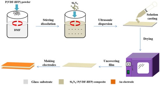 Silicon nitride (Si3N4) with a size ranging from 100 nm to 200 nm was obtained from Suzhou Yuante Material Co., Ltd. (Suzhou, China), and was further purified using analytic reagent ethyl alcohol. P(VDF-HFP) powder with a 91/9 mol% VDF/HFP ratio was purchased from Piezotech Co. (Pierre-Bénite, France). Si3N4/P(VDF-HFP) composite films were prepared using the solution casting method, as shown in Figure 1. P(VDF-HFP) was dissolved in dimethyl formamide (DMF) and then purified using the filter element. After that, purified Si3N4 nanoparticles were introduced into the solutions of P(VDF-HFP) with various mass fractions of 0 wt%, 5 wt%, 7.5 wt%, 10 wt%, 12.5 wt%, 15 wt%, 17.5 wt%, 20 wt%, and 22.5 wt%. After stirring for 12 h, the uniform solution was coated on the glass slides at room temperature in the oven for the drying process. Then, the solvent was evaporated at 70 °C for 12 h, and in order to remove the DMF solvent completely, the dried Si3N4/P(VDF-HFP) composite film was melted by holding it at 170 °C for 6 h. To modify the crystalline properties of P(VDF-HFP) [26], the hot Si3N4/P(VDF-HFP) melt was cooled rapidly to room temperature in air, and similar Si3N4/P(VDF-HFP) composite films with different Si3N4 fractions and a relatively uniform thickness of 30 μm were obtained. For electrical characterization, the different films were cut into the desired dimensions and gold electrodes 80 nm in thickness were sputtered on both sides of the film as the top and bottom electrodes.