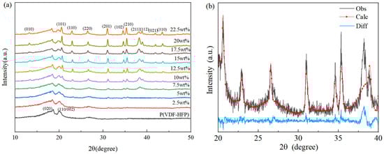 In order to investigate the influence of the introduction of Si3N4 into the crystal structure of P(VDF-HFP), Figure 2 shows the XRD diagram of Si3N4/P(VDF-HFP) composite film samples doped with different amounts of Si3N4. The pure P(VDF-HFP) film exhibited obvious characteristic diffraction peaks at 18.5° and 20.2°, corresponding to the (020) and (110/002) crystal planes, respectively [24]. Regarding these, (020) is the typical characteristic peak of the α-crystal phase, and (110/002) are the typical characteristic peaks of the β-crystal phase. Compared with the pure P(VDF-HFP) film, the XRD of the composite film samples doped with Si3N4 exhibited not only diffraction peaks of the polymer matrix but also the peaks of Si3N4 at the positions 13.3°, 20.6°, 22.9°, 26.5°, 31.1°, 34.5°, 35.3°, 38.1°, 38.3°, 41.9°, and 43.5°, corresponding to (010), (101), (110), (220), (201), (102), (210), (211), (112), (021), (310), and other crystal planes. Moreover, Figure 2b provides the refined result of the XRD patterns of Si3N4 particles, indicating the existence of the α-crystal phase in the Si3N4 sample obtained, and the pattern matches the standard card peak of slice PDF# 41-0360 [27]. The successful recombination of P(VDF-HFP) and Si3N4 is shown, and the characteristic diffraction peak intensity of Si3N4 was seen to gradually increase with the increase in Si3N4 content.