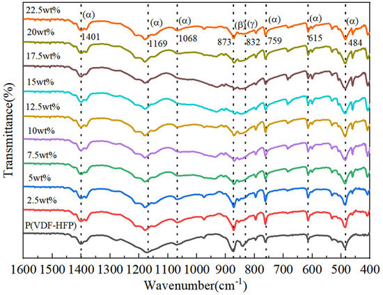 To further investigate and verify the crystal structure of Si3N4/P(VDF-HFP) composite films, FTIR was used to analyze the crystal structure of composite film samples with different Si3N4 contents, as shown in Figure 3. Clearly, the absorption peaks of the α phase, β phase, and γ phase appeared in all the thin-film samples. The six absorption peaks that appeared at 484 cm−1, 615 cm−1, 759 cm−1, 1068 cm−1, 1169 cm−1, and 1401 cm−1 corresponded to the α phase (TGTG conformation of -CF2-CH2- chains); the absorption peak at 873 cm−1 corresponded to the β phase (TTTT); and the absorption peak at 832 cm−1 corresponded to the γ phase (TGTG’) [30]. Among these absorption peaks, with the addition of Si3N4, the absorption peak intensity at 873 cm−1 of the β phase weakened, indicating that all the trans β-crystal phases decreased with the introduction of Si3N4 particles. Moreover, with the introduction of Si3N4, the absorption peak intensity of the α phase slightly increased, and the absorption peak at 832 cm−1 of the γ phase disappeared. This was due to the occurrence of the phase transition from the γ phase to the α phase. Additionally, importantly, the crystallinity of P(VDF-HFP) was slightly depressed by the introduction of Si3N4, and the FTIR results are consistent with the XRD results. This phase transition promotes the dielectric and energy storage properties of this kind of two-phase composite.