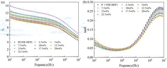 To clarify the effect of Si3N4 on the electric properties of P(VDF-HFP)-based composite films, Figure 5a,b present the variation trend of the relative dielectric constant (εr) and dielectric loss (tanδ) of different Si3N4/P(VDF-HFP) composite film samples with frequency and Si3N4 content. Firstly, it can be seen from Figure 5a that εr decreased with increasing frequency. According to the theory of polarization, when the frequency of the AC electric field is small, various polarization modes, such as electron polarization, atomic polarization, dipole orientation polarization, and interface polarization of the dielectric material, will contribute to εr. Therefore, εr is relatively high at low frequencies. As the frequency increases, the dipole orientation polarization cannot keep up with the rate of change in frequency, making it unable to play its great role, resulting in the decrease in εr. As the frequency further increases and the dipole orientation polarization is further weakened, εr is greatly reduced at high frequencies. In addition, with the increase in Si3N4 content, the Si3N4/P(VDF-HFP) composite films’ εr was enhanced to a certain extent: the value of the 10wt% Si3N4 reached 14 at 100 Hz, which is 33.3% higher than that of pure P(VDF-HFP) (~10.5). The reason for the enhancement of εr is that the appropriate addition of Si3N4 increases interface polarization and ion polarization.