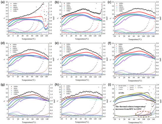 Dielectric property–temperature patterns of Si3N4/P(VDF-HFP) composites at frequencies of 100 Hz, 1 kHz, 10 kHz, 100 kHz, and 1 MHz for (a) 0 wt%, (b) 2.5 wt%, (c) 5 wt%, (d) 7.5 wt%, (e) 10 wt%, (f) 12.5 wt%, (g) 15 wt%, and (h) 20 wt%. (i) Dielectric property–temperature patterns of all Si3N4/P(VDF-HFP) composites at the frequency of 1 kHz.