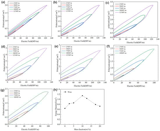 In addition, Figure 7a–g show the unipolar hysteresis loops of all Si3N4/P(VDF-HFP) composite film samples at a frequency of 10 Hz under an increasing electrical field. Clearly, the maximum polarization (Pm) and residual polarization (Pr) of all samples gradually increased with the increase in the electric field. This is because a large electric field can cause large orientation polarization in a material. As the content of Si3N4 increased, Pm and Pr first increased and then decreased. The main reason for this is that an appropriate amount of Si3N4 can increase interface polarization and ion polarization. However, excessive Si3N4 will cause more defects in the material, leading to an unpleasant current leakage. In order to determine the energy storage performance of Si3N4/P(VDF-HFP), composite film samples were prepared by the institute as raw materials for capacitors, and the formula [8]