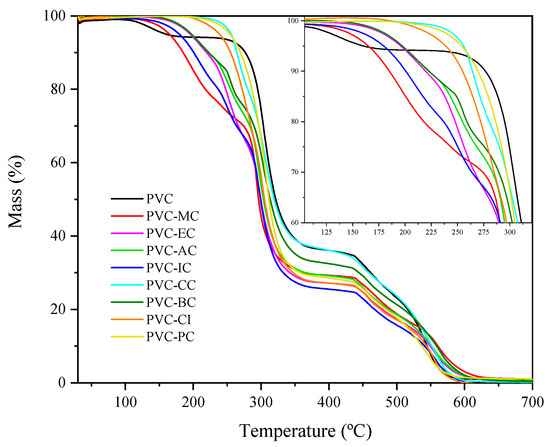 The thermal stability and degradation of the PVC and plasticized PVC formulations were evaluated using thermogravimetric analysis (TGA) on a Mettler-Toledo TGA/SDTA 851 thermobalance (Schwerzenbach, Switzerland). All the analyses were performed in a nitrogen atmosphere on the samples weighing approximately 5 mg, with a temperature cycle ranging from 30 to 700 °C at a constant heating rate of 20 °C min−1.
