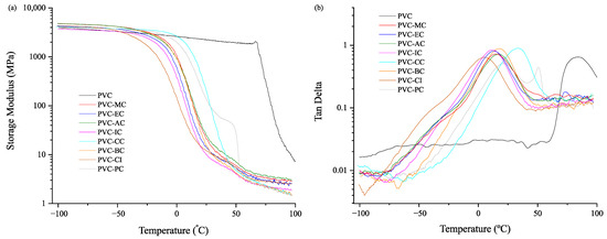 Plot evolution of (a) the storage modulus (E’) vs. temperature and (b) the dynamic damping factor (tan d) vs. temperature for the unplasticized PVC and plasticized PVC with the cinnamic acid-based plasticizers within the −100 to 100 °C range.