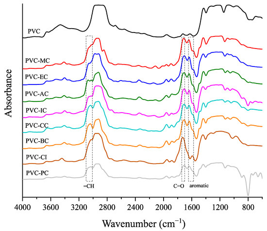 FTIR spectra of the neat PVC and plasticized PVC formulations with the different cinnamic acid-based plasticizers within the 4000 to 800 cm−1 range.