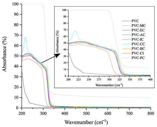 UV-Vis spectra of the neat PVC and plasticized PVC formulations with the different cinnamic acid-based plasticizers within the 200–800 nm range.