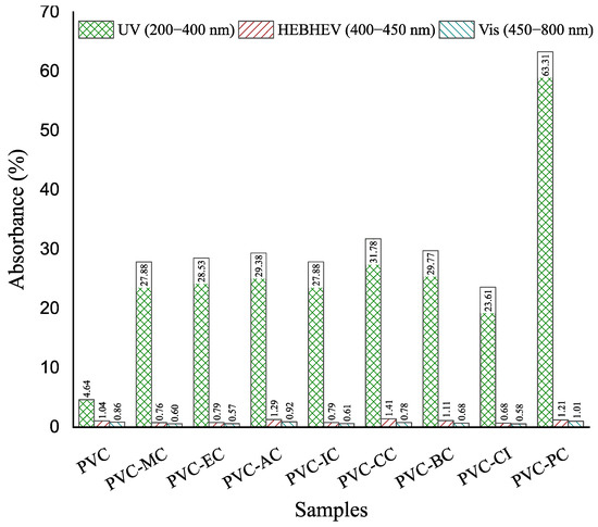 UV-Visible spectrophotometry (UV-Vis) was used to evaluate the shielding properties of films against ultraviolet (UV) light (200–400 nm), high-energy visible blue light (HEV, 400–450 nm) and visible light (Vis) (400–800 nm) [29]. The neat PVC and plasticized PVC film samples were analyzed at room temperature within the 200–800 nm absorption spectrum by a UV-Vis spectrophotometer Perkin Elmer Lambda 35 (Waltham, MA, USA).