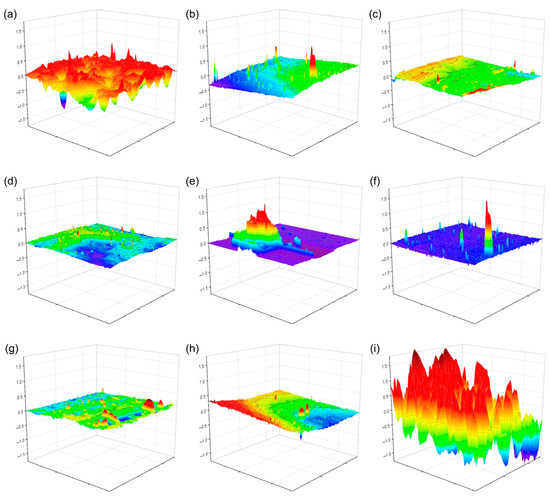 AFM topographic images of the films of the neat PVC and plasticized PVC formulations with the different cinnamic acid-based plasticizers: (a) pure PVC, (b) methyl trans-cinnamate (MC), (c) isobutyl cinnamate (IC), (d) allyl cinnamate (AC), (e) ethyl cinnamate (EC), (f) cinnamyl cinnamate (CC), (g) cinnamyl isobutyrate (CI), (h) benzyl cinnamate (BC) and (i) phenethyl cinnamate (PC). Red color corresponds to the maximum value and purple the minimum value.