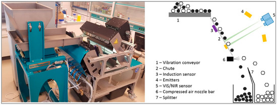 The provider of the used sensor-based chute sorting setup (Figure 2) has a technical facility where the trials are conducted. It is designed as a two-way system, which can be set up with different sensors like visual spectroscopy (VIS) transmission/reflection, NIR and metal detection. In the present feasibility study, the NIR sensor Photonfocus MV3-D640I-CL was used. The system is endowed with a chute width of 0.4 m.