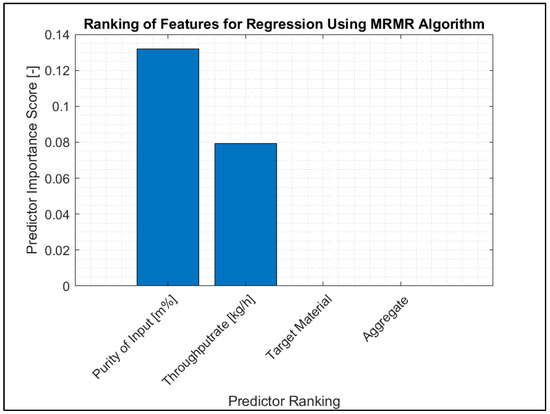 The performed feature selection supports this intuition. The results of ranking features for regression using MRMR algorithms (Figure 6) show that two of the four evaluated parameters mainly influence the sorting result. The target material to be sorted and the selected aggregate (SBS setup) have low prediction value. This means the sorting result mainly depends on the purity of the input material and the throughput rate. The purity of the input has a predictor importance score of 0.13, while the throughput rate has a score of 0.08.