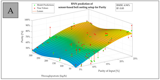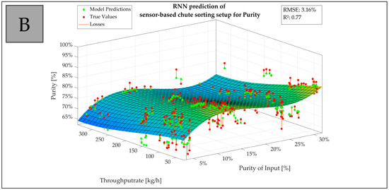 Figure 8 visualizes an example depiction of model predictions on test sets with losses calculated on model prediction vs. true value with a 3D fitted curve. It shows the trend of the actual data related to the purity of input and throughput rate on the sensor-based belt sorting setup (A) and the sensor-based chute sorting setup (B) including R2 and RMSE for the underlying prediction model.