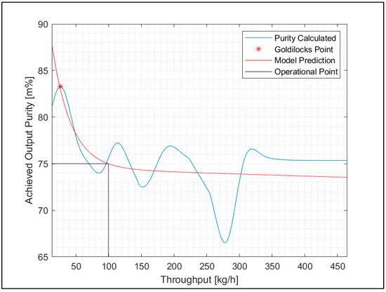 Furthermore, Figure 9 shows the Goldilocks point for the regression model. This principle appears when there is a clear optimum for a value. The Goldilocks point is reached when the highest calculated purity hits the model’s predicted purity for the maximum possible throughput rate. As the Goldilocks point for that model can only be reached for an unacceptably low throughput rate, the scenario in Figure 9 is not realistic for running a plant.