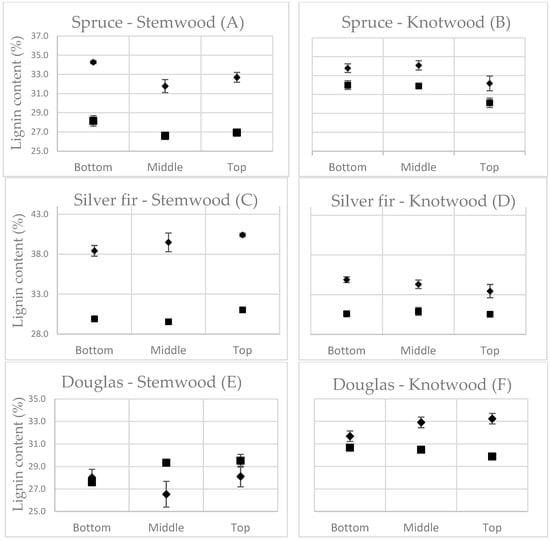 For stemwood, the bottom, middle, and top variables were at approximately the same relative height for all species. For knotwood, the relative height of knots varied more broadly concerning the bottom position, which might explain higher variances. Since juvenile wood, sapwood, and heartwood were mixed, our samples were to be considered an average of all three. Naturally, depending on the height, there was a greater relative quantity of juvenile and sapwood. Though this might explain some higher or lower quantities of Klason lignin, it only marginally affected Py-lignin content.
