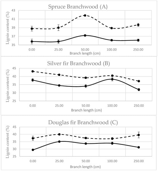 Comparatively to compression wood at the base of the branch, branchwood has not been extensively studied in the literature because, usually, it is mostly considered non-recoverable and left as residual wood. To increase branchwood added value, it seemed important to gather more information on branches. Comparisons of Klason lignin and Py-lignin along the branches of spruce, silver fir, and Douglas fir are presented in Figure 3.