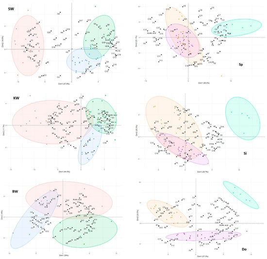 Principle component analysis of different tissues and species: (SW) stemwood, (KW) knotwood, (BW) branchwood, (Sp) spruce, (Si) silver fir, (Do) Douglas fir. Blue dots correspond to spruce, green dots to silver fir, red dots to Douglas fir, teal dots correspond to branchwood, orange dots to stemwood and purple dots to knotwood. Ellipse color corresponds to the same colored dots.