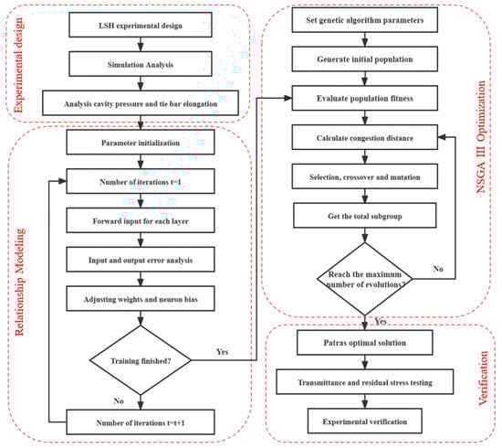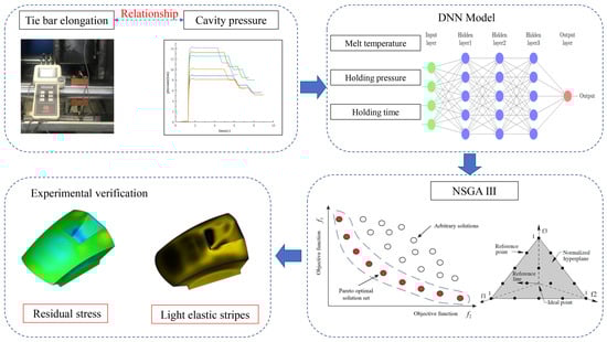 As evident from the aforementioned studies, the amalgamation of artificial intelligence algorithms proves highly effective in analyzing and optimizing injection molding process parameters [17,18,19]. By aggregating and scrutinizing extensive historical data, sensor data, and product quality data, AI algorithms can construct predictive models and correlation models that forecast the effects of varying process parameters on product quality. This enables the identification of the optimal combination of process parameters. [20] In line with the focus of this study, which centers on the interplay between tie bar elongation, cavity pressure, and lens quality, a DNN was utilized to establish a mathematical model linking these three process parameters to the objective function. Subsequently, the NSGA-III algorithm was employed for the multi-objective optimization of parameter settings, leading to the identification of the best process parameters via the Pareto front. Finally, transmissivity testing was conducted to validate the feasibility of the experimental method, as illustrated in Figure 1.