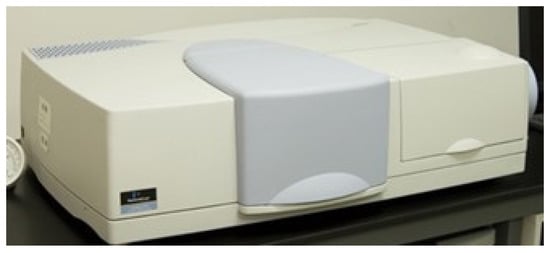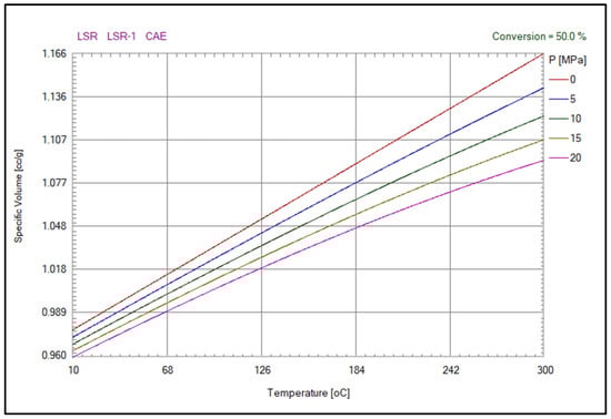 The PVT curves of LSR in Moldex-3D’s material database are shown in Figure 2. The curves show the relationship at different pressures (0–20 MPa), volumes, and temperatures. By analyzing the PVT curve, the physical and chemical properties of liquid silicone rubber under different conditions can be determined, and then its processing process and application characteristics can be optimized. The PVT curve is also one of the important indicators for assessing the thermodynamic stability and phase change characteristics of liquid silicone rubber. In addition, the feasibility of this method was verified in this study by performing a quality check of the transmittance of the finished LSR lenses using a Lambda 950 UV/VIS spectrometer manufactured by PerkinElmer, Waltham, MA, USA (Figure 3).