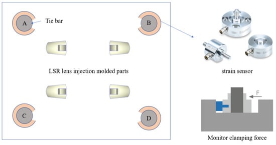 In addition, the structure of the experimental measurement of lens injection molding in this study is schematically shown in Figure 7, including an injection molding machine, strain sensors, a data acquisition (DAQ) interface, and a computer. Among them, four strain sensors are mounted on each of the four tie bars of the injection molding machine. The injection molding machine accurately measures the clamping force acting on the mold halves during the injection process through the tie bar strain sensors to achieve online detection of tie bar elongation changes. Therefore, installing strain sensors to measure the clamping force during the injection molding process and inferring the pressure inside the mold cavity based on the clamping force can help better control the parameters of the injection molding process to ensure the production of high-quality plastic parts.
