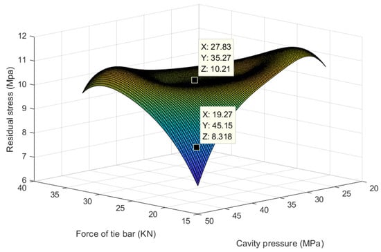 Based on Figure 9, it becomes evident that the residual stress values do not exhibit a monotonic increase or decrease across the range of tie bar force and cavity pressure variables. In fact, they display distinct trends for different combinations of tie bar force and cavity pressure. As observed in the data plot, residual stresses tend to be lower in the central region and higher on both ends within the spectrum of tie bar force and cavity pressure. This implies that the residual stress values are elevated when the tie bar force and cavity pressure are either small or large, whereas within the intermediate range, the residual stress values are comparatively lower. This pattern may be attributed to the fixed mold force and mold cavity pressure, providing further evidence of the significant influence of tie bar force and cavity pressure on residual stress during the injection molding process.