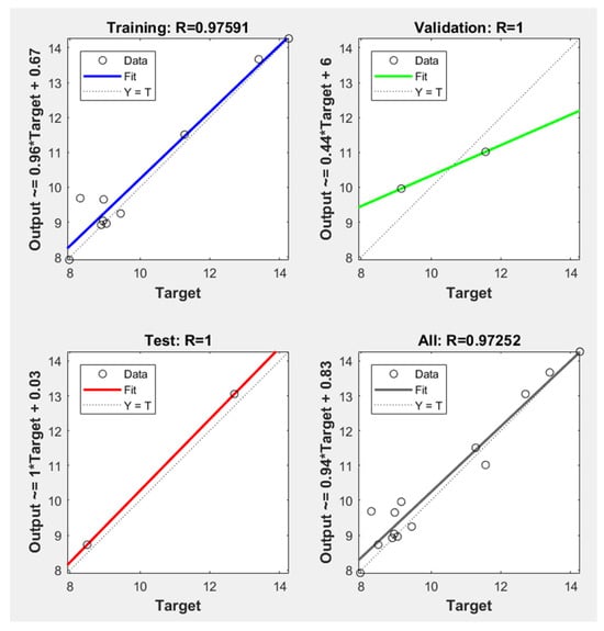 These factors exhibit varying magnitudes, and directional anisotropy was selected as the basis for constructing the model. A DNN model was constructed for prediction and the R2 metric was used to measure the performance of the model. Figure 10 presents the outcomes obtained through the application of the DNN for quality prediction. As depicted in the regression model plot, it is evident that the prediction results for the training set are highly accurate, underscoring the precision and quality of the prediction model. Furthermore, we conducted 10 cross-validation tests, and our DNN model consistently demonstrated strong performance in predicting the quality of injection-molded parts. In each case, the R2 value exceeded 0.9, signifying the significance of this surrogate model. Figure 10 illustrates the relationship between actual and predicted values of sample points, where data points are symmetrically distributed around the ideal straight line. This distribution confirms the model’s high accuracy and its suitability for fitting response values under varying factor combinations.