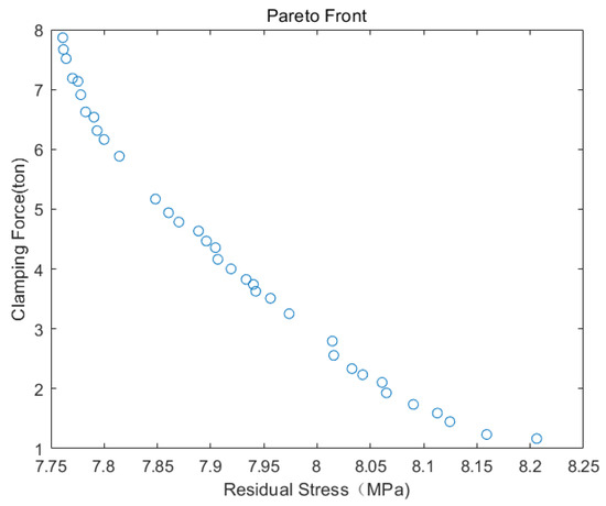 The set of Pareto optimal solutions is illustrated in Figure 11. Analysis of the Pareto optimal solution set reveals a mutual constraint between the two optimization objectives. It becomes evident that there is no combination of process parameters that simultaneously optimizes both objectives. Therefore, selecting the most suitable set of solutions is necessary according to different weights. Following global optimization using NSGA-III, the optimal process parameters are determined as follows: 34.92 °C for melt temperature, 33.97 MPa for curing pressure, and 9.96 s for curing time. As shown in Table 5, the residual stress and clamping force were reduced by 12.98% and 47.14%, respectively, compared to the initially recommended process parameters. This signifies a significant enhancement in optimization outcomes.