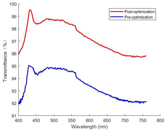 LSR lens transmittance test results in the visible light range (blue line is the residual stress of 14.271 MPa before optimization, red line is the residual stress of 7.544 MPa after optimization).