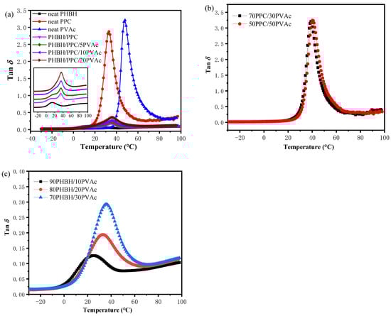 Damping factor (tan δ) curves of (a) neat PHBH, PPC, PVAc, PHBH/PPC binary and PHBH/PPC/PVAc ternary; (b) PPC/PVAc binary and (c) PHBH/PVAc binary blends.