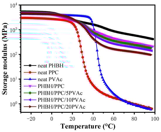 Storage modulus (E′) curves of neat PHBH, PPC, PVAc, PHBH/PPC blends and PHBH/PPC/PVAc blends.