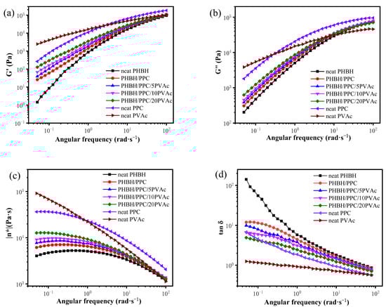 Dynamic viscoelastic properties of neat PHBH, PPC, PVAc, PHBH/PPC blends and PHBH/PPC/PVAc blends at 155 °C: (a) storage modulus (G′), (b) loss modulus (G′′), (c) complex viscosity (|η*|) and (d) loss tangent (tan δ).