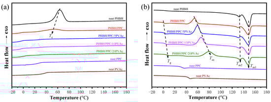 A differential scanning calorimetry (DSC) test was performed to study the thermal behaviors of neat components and their blends, as recorded in Figure 6. The thermal parameters are summarized in Table 2. Figure 6a clearly indicated that neat PHBH exhibited a significant crystallization exothermic peak (Tc) at about 50 °C. Neat PPC and PVAc had no crystallization peak, suggesting their amorphous characteristics. For the PHBH/PPC binary blends, it was observed that the Tc of PHBH shifted to a low temperature, suggesting that the crystallization of PHBH was suppressed by adding the PPC phase. Similarly, for the immiscible PHBH/PBAT and PHBH/PBS blends, the presence of PBAT and PBS inhibited the crystallization of PHBH [,]. In contrast, PCL was found to promote the crystallization of PHBH in immiscible PHBH/PCL blends []. However, for the PHBH/PPC/PVAc blends, no crystallization peaks were observed, suggesting that the presence of PVAc inhibited the crystallization of PHBH.