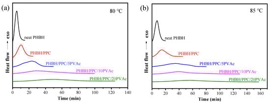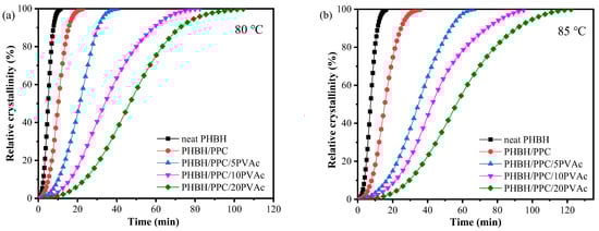 In this section, the influence of PVAc content on the isothermal melt crystallization kinetics of the PHBH/PPC blend was further investigated with DSC. DSC scans of isothermal crystallization of neat PHBH and all blends at 80 and 85 °C are presented in Figure 7. The relative crystallinity (Xt) at crystallization time (t) was determined with the following equation []: