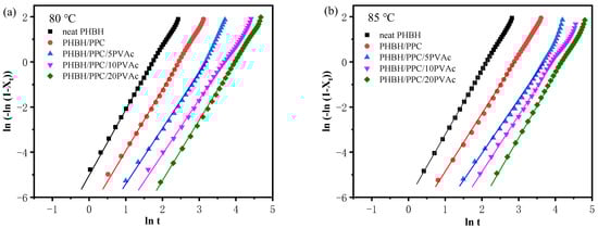 Avrami curves of neat PHBH and its blends at (a) 80 and (b) 85 °C.