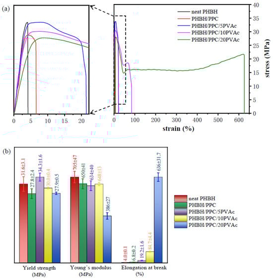 The stress−strain curves of neat PHBH, the PHBH/PPC blends and the PHBH/PPC/PVAc blends are presented in Figure 10, and the mechanical properties of all samples are summarized in Table 4. Based on Figure 10a, neat PHBH was a rigid polymer and exhibited a brittle fracture fashion with much lower elongation at the break of 4.0%. It could be seen that the PHBH/PPC binary blend also failed in brittle mode, while it showed improved elongation at the break compared to neat PHBH. It could be expected that the modulus and yield strength of the binary blend were smaller than those of neat PHBH. This could be mainly due to the fact that the phase-separated morphology of the PHBH/PPC blend led to the interfacial debonding.
