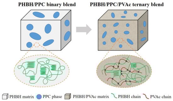 To remove moisture, before processing, PHBH, PPC and PVAc were dried at 80 °C under vacuum for 10 h. Melt blending of samples with different PVAc content was carried out with an internal mixer (XSS300, Shanghai Kechuang Rubber Plastic Mechanical Equipment Co., Ltd., Shanghai, China). Blending parameters included temperature of 160 °C, screw speed of 60 rpm and residence time of 7 min. The blended samples were hot-pressed at 170 °C and under a fixed pressure of 10 MPa for 3 min, then cold-pressed at room temperature and 10 MPa for 3 min to obtain 1-mm thick samples for tests. The weight composition of PHBH/PPC = 70 wt%/30 wt% was fixed in binary and ternary blends. For the PHBH/PPC/PVAc blends, PVAc contents were 5, 10 and 20 wt% of the total ternary blends. It was worth noting that neat PHBH, neat PPC, PHBH/PPC binary, PPC/PVAc binary and PHBH/PVAc binary blends undergoing the same thermal processing were also prepared as control samples. The PVAc weight content was set as 30 and 50 wt% in the PPC/PVAc binary blends and as 10, 20 and 30 wt% in the PHBH/PVAc binary blends.