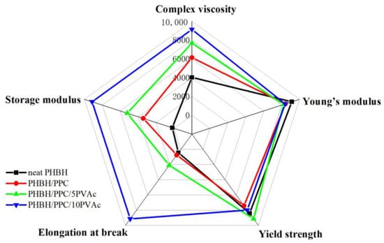 Figure 12 shows the comprehensive properties of neat PHBH, the PHBH/PPC blends and the PHBH/PPC/PVAc blends, including the yield strength, Young’s modulus, elongation at the break, melt viscosity and storage modulus at an angular frequency of 0.05 rad s−1. As can be seen from Figure 12, the incorporation of PVAc into the PHBH/PPC blends significantly improved the flexibility and melt viscoelasticity of ternary blends. Compared to neat PHBH, the melt viscosity, melt elasticity and elongation at the break of PHBH/PPC/10PVAc blend were increased by 126%, 4636% and 2000%, respectively, while the yield strength and Young’s modulus decreased by only 8% and 5%, respectively. Therefore, the significant increase in flexibility and melt viscoelasticity with no deterioration in strength compared to neat PHBH were achieved by adding small amounts of amorphous PVAc into the PHBH/PPC binary blend, which was positive for expanding the applications of PHBH blends.