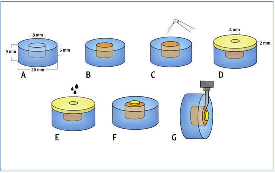 Figure 1. Sample preparation process. (A) Sample carrier plastic block with a cylindrical hole. (B) The hole to be filled with the temporary crown and bridge material base cylinder. (C) Surface treatment was conducted using air abrasion (on the required samples). (D) A metal mold with a central cylindrical hole was adapted over the top surface of the sample carrier. (E) Surface treatment using etchant and bonding agent was carried out (on the required samples). PMMA/a flowable resin composite material was applied into the mold (on the required samples). (F) The prepared sample. (G) The shear bond strength testing was carried out.
