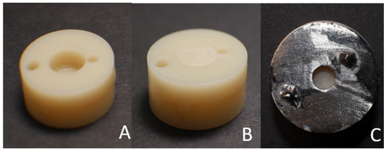 Figure 2. (A) Sample carrier plastic block with a cylindrical hole. (B) CAD/CAM, either milled or 3D printed, placed in the cylindrical hole. (C) A cast-metal mold with a cylindrical hole adapted over the top surface of the sample carrier.