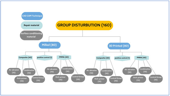 Random selection was used to determine which samples of the milled and 3D-printed base cylinders would be subjected to which bonding conditions. The groups are shown in Figure 3.