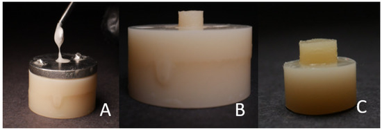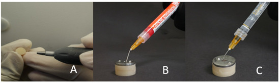 The base cylinders (10 milled and 10 3D-printed) were fitted inside the cylindrical plastic block. The metal mold was fitted on the top surface of the cylindrical plastic block, and it was used to apply the PMMA material to the middle surface of the base cylinders. The test surfaces of the base cylinders (10 milled and 10 3D-printed) were initially wettened with the monomer with a brush. PMMA (UNIFAST III, GC America, Alsip, IL, USA), monomer powder, and liquid were mixed in a dampened dish with a ratio of 1:3 by volume. The mixture was stirred rapidly with a cement spatula for 10–15 s. The acrylic mixture was placed in a single syringe and injected through the hole of the delivery mold (Figure 4A). The acrylic was handled according to the manufacturer’s instructions.