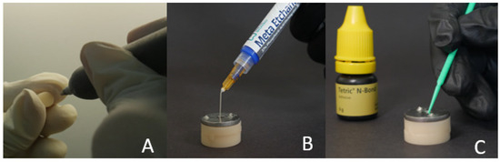 Figure 5. Surface conditioning for the composite using the following methods: (A) air abrasion; (B,C) acid etching-primer application or both.