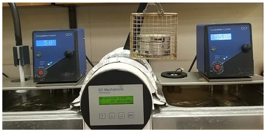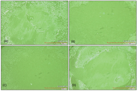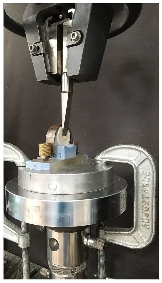 The base cylinders along with the repair cylinders were subjected to thermocycling in a thermocycling unit (SD Mechatronik, Bayern, Germany) from 5 °C to 55 °C for up to 5000 thermal cycles (dwell time of 30 s), thereby simulating a 6-month period of clinical service (Figure 7). An Instron 3345 (Instron, Norwood, MA, USA) was used to mount the specimens with a customized stainless-steel holder and a jig; this was conducted at a crosshead speed of 0.5 mm/min (Figure 8). A crosshead speed of 0.5 mm/min was used to apply the load directly at the interface between the base cylinder and the repair cylinder until fracture. The shear bond strength (MPa) was calculated by dividing the fracture load (N) by the area of the bonded interface (mm2). After the test, each fractured surface was examined by field emission scanning electron microscopy (FE-SEM S4700, Hitachi, Tokyo, Japan), for the fractography analysis. Each sample’s failure mode (cohesive, adhesive, or mixed) was identified by a blinded examiner using a stereomicroscope at a magnification of 40 (Figure 9). Failure at contact between the flowable composite and the temporary crown and bridge material was where the adhesive failure was noticed. When just the flowable composite or the temporary crown and bridge material failed, this was known as cohesive failure. An adhesive failure with a cohesive failure of either of the nearby substrates (flowable composite/PMMA/temporary crown and bridge material) was known as a mixed failure.