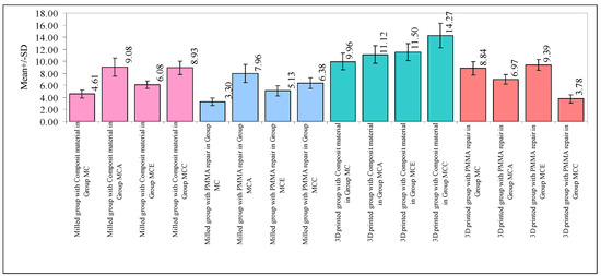 The primary groups (milled and 3D-printed) showed significant differences in the shear bond strength (F = 270.9076, p = 0.0001). The 3D-printed samples had an increased mean SBS when compared to the milled samples. The composite material repaired group had a greater mean SBS than the PMMA repaired group (F = 259.2048, p = 0.0001). The SBS differed significantly among the four milled group subgroups (MC, MCA, MCE, and MCC) (F = 24.0838, p = 0.0001) (Table 5). Groups MCA and MCC had a significantly greater mean SBS than Groups MC and MCE. The primary groups (milled and 3D-printed) and materials (composite material and PMMA repair) also showed significant differences in the SBS (F = 65.1731, p = 0.0001). The 3D-printed group with composite material had the highest mean SBS, while the milled group with PMMA repair had the lowest. Other groups fell in between. The interactions between the main groups (milled and 3D-printed) and the four subgroups (Group MC, Group MCA, Group MCE, and Group MCC) also affected the SBS (F = 44.2177, p = 0.0001). The 3D-printed group with Group MC and Group MCE had the highest mean SBS, while the milled group had the lowest. Other groups had intermediate findings. Composite material and PMMA repair interactions with the four subgroups (Group MC, Group MCA, Group MCE, and Group MCC) significantly affected the SBS (F = 43.4077, p = 0.0001). Composite material with Group MCA and Group MCC had the highest mean SBS, whereas PMMA repair with Group MC and Group MCC had the lowest. Other groups had various strengths. Finally, the SBS was affected by the main groups, materials, and four subgroups (F = 23.0496, p = 0.0001). The mean SBS varied between the primary groups, materials, and subgroups.