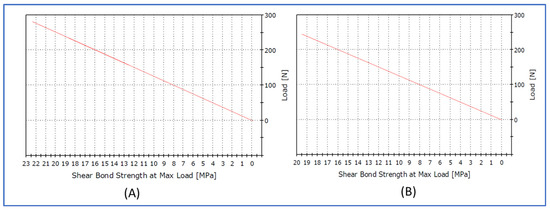 Figure 11. Graph showing the bond strength of the positive controls in relation to maximum load applied. (A) Milled positive control. (B) 3D-printed positive control.