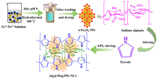 2.3. Synthesis of Alg@Mag/PPy NCs