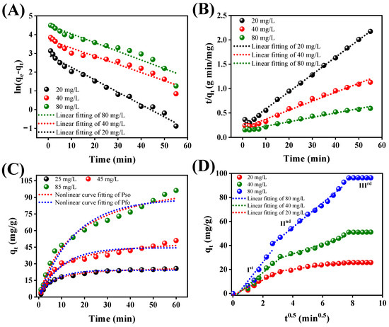| Kinetics | Parameters | 20 mg/L | 40 mg/L | 80 mg/L | Kinetics | Parameters | 20 mg/L | 40 mg/L | 80 mg/L |
