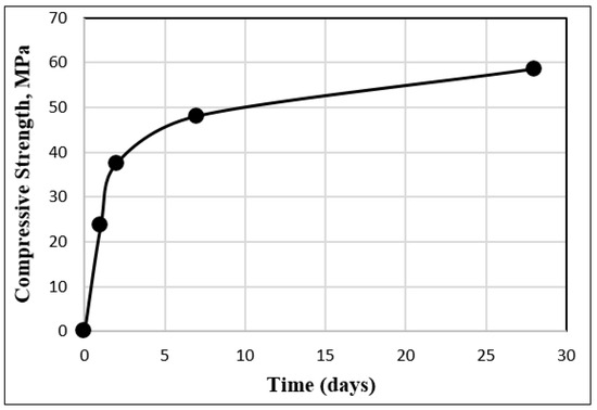 Mortar mixtures were prepared using an Ordinary Portland Cement of CEM I 52.5 N confirming NF EN 197-1/A1 standard, and manufactured by EQIOM located in Heming, France [31]. This cement had a specific gravity of 3.11 g/cm3 and a surface area determined through laser granulometry of 5600 cm2/g. The increase in compressive strength over time and the chemical composition of the cement, as detailed in the technical documentation provided by the manufacturer, are illustrated in Figure 1 and Table 1.