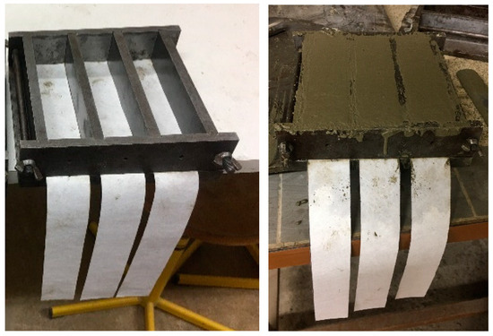 In order to find the adhesion properties between mortar and non-woven sheets, 40 × 40 × 160 mm prisms were prepared. Here, the sheets were cut to a width of 40 mm, corresponding to the prism’s width, and a length of 400 mm (160 mm prism’s length + 240 mm for pulling). First, all sides of the molds were oiled to facilitate easy demolding, and then the cut sheets were positioned within the mold, as shown in Figure 4. Subsequent to completing the mixing procedures, the mortar was poured inside the molds, and the molds were fixed in an automated jolting unit. The entire setup, including the table, mold, hopper, and clamping mechanism, was raised and then dropped a total of 60 times.