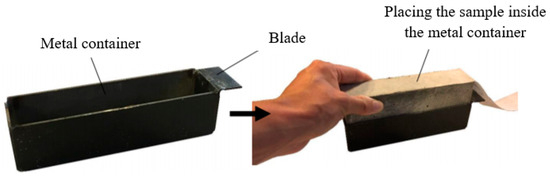To observe the bonding properties, 180° pull-out tests were performed in accordance with the guidelines of ASTM D 903-98 [46]. For such a testing procedure, a metal container was fabricated on-site within the laboratory of INSA de Strasbourg. This container was designed to provide enough space for the proper insertion or removal of the prisms. Furthermore, the container featured a blade at one end to secure the entire setup to the testing machine. While the opposite end was free, the sheet was bent from the bottom of the samples to the top, and the sheet was fixed on the top of the machine, as shown in Figure 5.