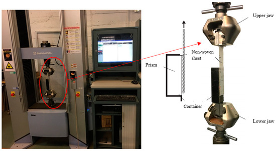 The 180° pull-out test was performed with the help of a Shimadzu 100 KN traction machine. The metal container’s blade was secured to the lower jaw, while the unattached end of the fabric sheet was clamped in the upper jaw, as displayed in Figure 6. Once the metal container was firmly in place, the test started, and the machine systematically drew the sheets away from the prisms. During this process, the non-woven sheet detached from the prism’s surface, and measurements of displacement (A) and peeling force (F) were taken at regular intervals. The traction speed was set to 10 mm/min; readings were taken at intervals of Δt = 0.01 s, accumulating an average of 80,000 data points for each individual specimen. Therefore, the test for one sample was completed in (16–20 min) intervals.